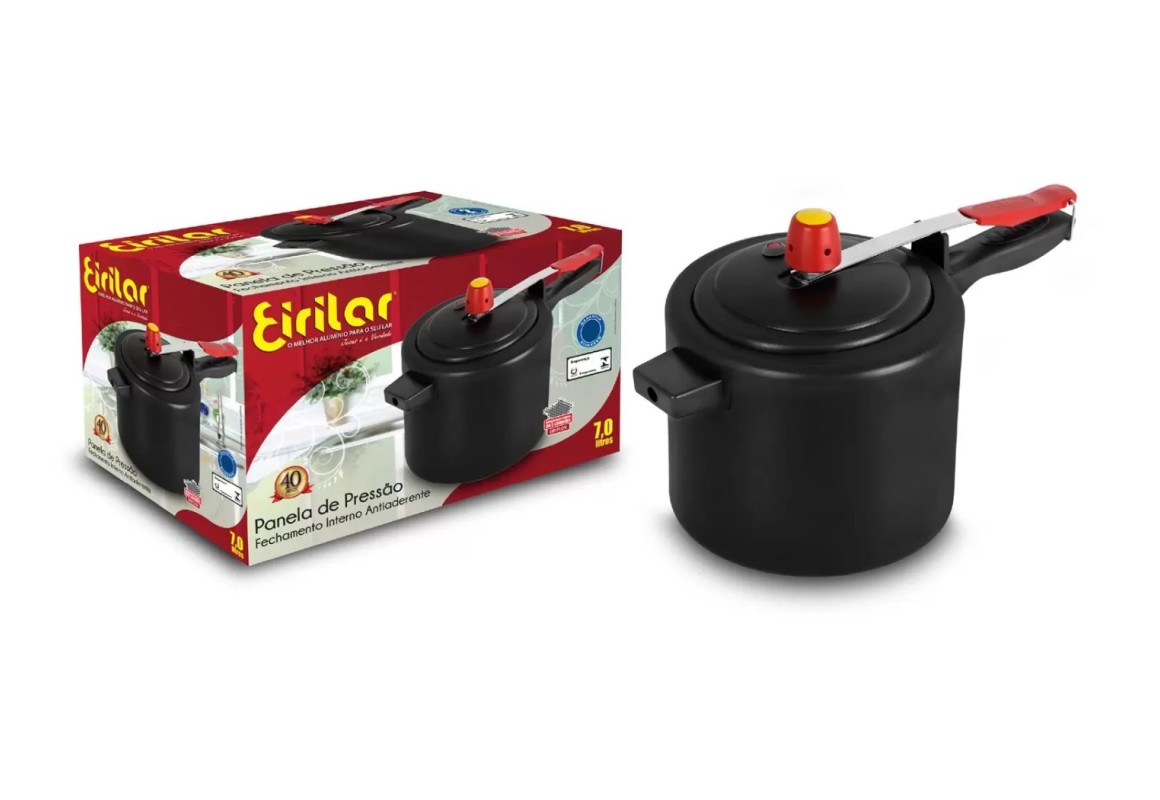 A panela de pressão Eiriflon 7L da Eirilar foi desenvolvida especialmente para atender a um segmento de mercado que necessita preparar pequenas porções de alimentos. A pressão de trabalho é de 80 KPA, oferecendo maior rapidez no cozimento de alimentos e consequentemente economia de energia em comparação com outras existentes no mercado com pressão de trabalho inferiores. O cabo e alça são confeccionados em baquelite que resistem ao calor propagado pelas paredes das panelas ao serem levadas ao fogão.