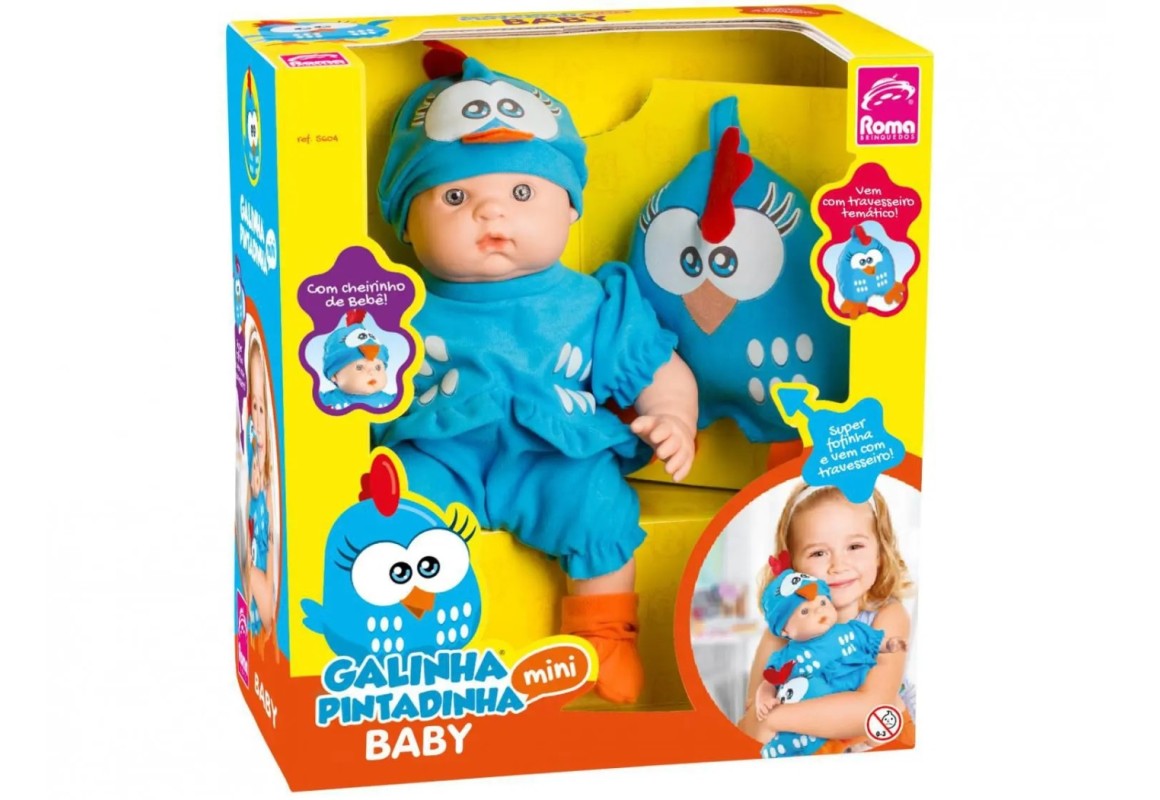 O boneca Galinha Pintadinha Baby mini da Roma é o maior sucesso! Essa linda bonequinha com corpinho em tecido e que possui braços, perninhas e cabeça em vinil perfumado e macio. Tudo isso em uma linda roupinha temática que a deixa linda! Além disso, a boneca acompanha um acessório super fofo, um travesseirinho no formato da personagem Galinha Pintadinha. É gostosa de apertar e vem com cheirinho de bebê.