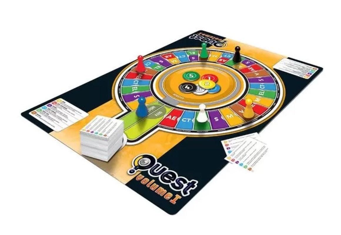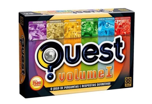 Um jogo de perguntas e respostas. Quest Volume I traz 2.520 perguntas, divididas em 6 temas diferentes. Antes de responder a cada pergunta, o jogador deve apostar a quantidade de pontos que deseja andar no tabuleiro se acertar a resposta. Os jogadores podem ainda escolher os temas que mais conhecem para responder. Mas é bom saber todos os assuntos, pois no final você terá de responder a uma pergunta do tema escolhido pelos outros jogadores. Você topa esse desafio?