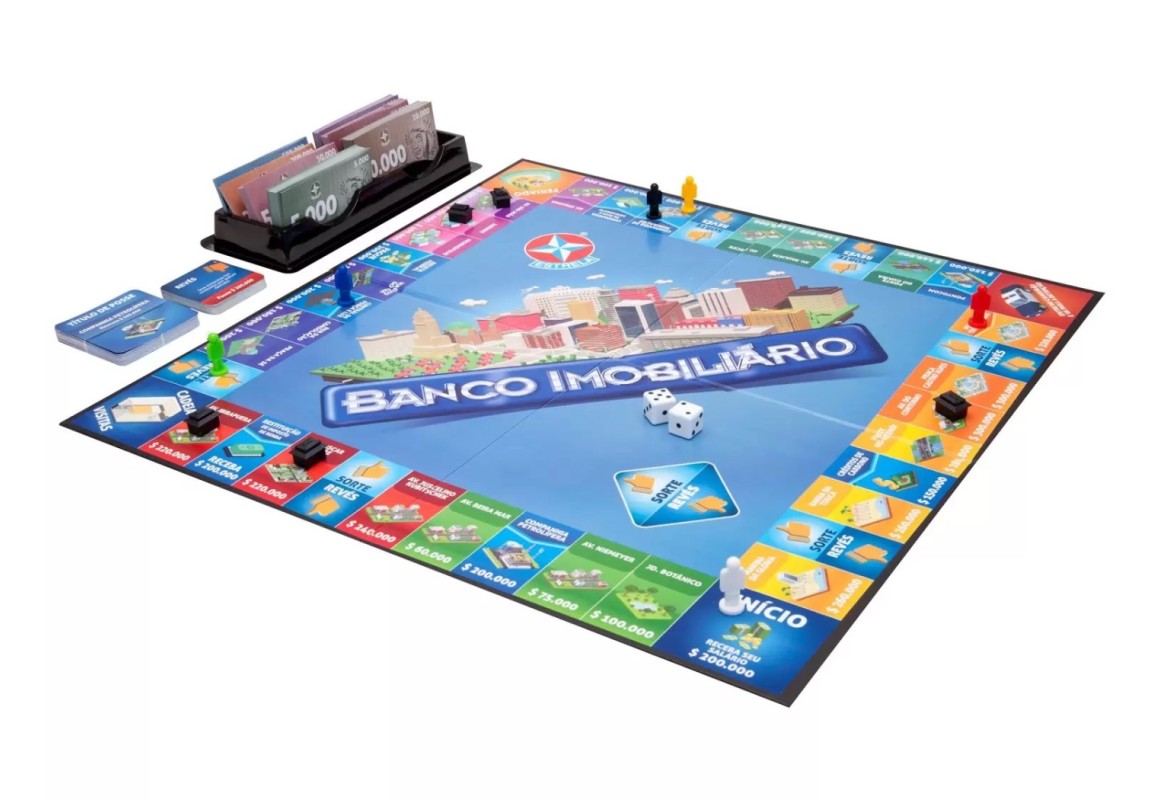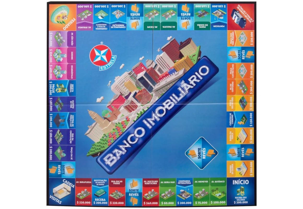 Jogo de Tabuleiro Banco Imobiliário - EstrelaO Jogo Banco Imobiliário é um dos jogos mais famosos! Tem como objetivo comprar vários imóveis e falir seus adversários! O último que ainda tiver dinheiro vence. Com a duração média das partidas sendo de 2 horas. Recomendado para crianças a partir de 8 anos de idade devido aos papéis. Além do Tabuleiro, dados, notas, etc... ainda possui um aplicativo inovador com objetivos e imprevistos para dar mais imersão na brincadeira tornando o jogo mais dinâmico e divertido.